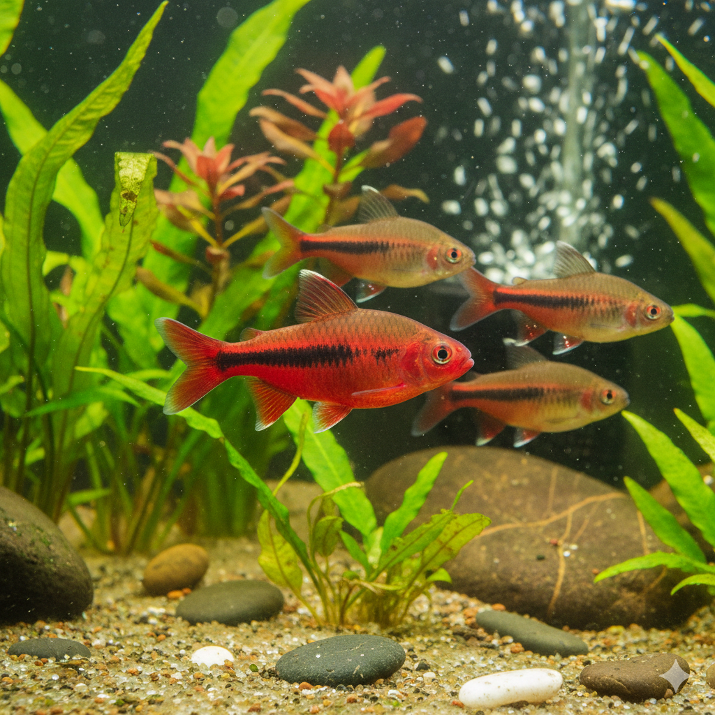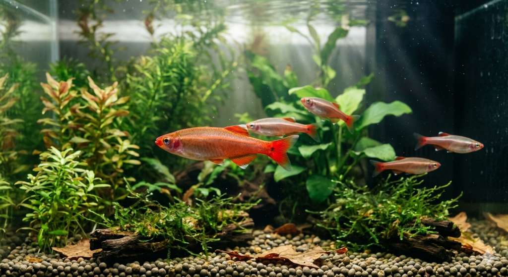 どちらもコイの仲間で、小型かつ丈夫です。特にチェリーバルブは体が赤く染まるため、緑色の水草水槽に入れると色彩のコントラストが際立ち、水槽全体が華やかになります [04:31]。